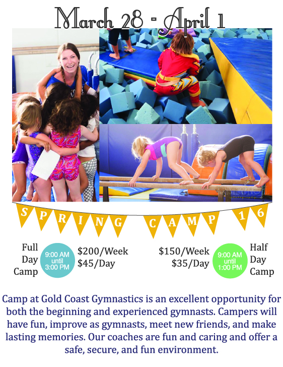 Come to Gold Coast Gymnastics over Spring, Summer, Fall or Winter Break! It’s a fun, active alternative to spending all day at home, and a great option for working parents. We have both half-day and full-day options. Parents love the security of knowing that their kids are in safe hands. Kids love spending time with friends while learning more about gymnastics.